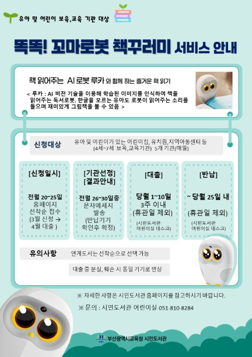 [파이낸셜경제=박영진 기자] 부산시교육청 시민도서관은 어린이집, 유치원, 지역아동센터 등 4~7세 유아 및 어린이가 있는 기관을 대상으로 ‘똑똑! 꼬마로봇 책꾸러미’ 서비스를 운영한다고 19일 밝혔다.