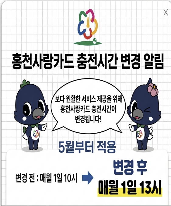| ▲ 홍천사랑카드 충전시간 변경 운영, 5월부터 매월 1일 오후 1시 충전 시작..시스템 안정성 높이고 이용 불편 줄여 |