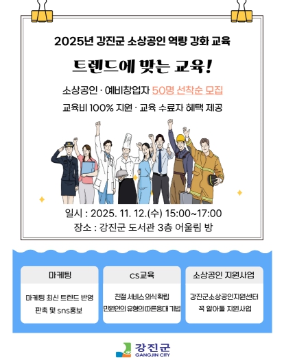 [파이낸셜경제=김예빈 기자] 강진군이 관내 소상공인과 예비창업자를 대상으로 매출 증대를 위한 실전 중심의 교육을 운영한다. 교육 신청은 오는 11월 7일까지 진행되며, 교육은 11월 12일 수요일 오후 3시부터 5시까지 강진군 도서관 3층에서 실시될 예정이다.