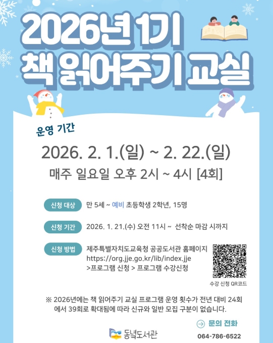 [파이낸셜경제=김영란 기자] 제주도교육청 동녘도서관은 2월 1일부터 22일까지 평생교육실에서 유아 및 저학년 어린이의 독서 흥미와 창의력 향상을 위한 ‘2026년 1기 책 읽어주기 교실’을 운영한다.