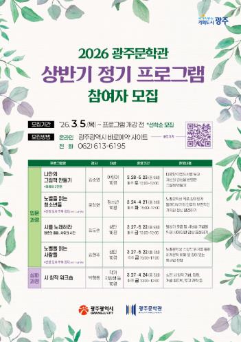 [파이낸셜경제=김예빈 기자] 광주광역시는 시민의 문학적 감수성과 창작 역량을 키우기 위해 ‘2026년 광주문학관 상반기 정기 프로그램’을 운영한다.