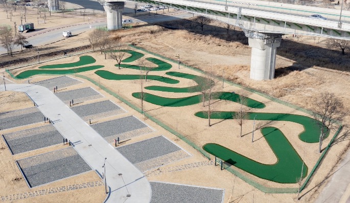 34억 원이 투입된 이곳은 10m×10m 대형 규격의 오토캠핑 50면과 함께 미니골프 9홀, 어린이놀이터 등 가족 단위 부대시설을 완비했다.