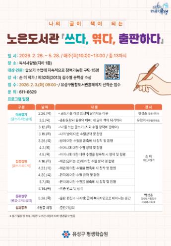 프로그램에서는 글쓰기와 출판에 대한 기본 이해를 시작으로, 개인의 경험을 담은 시·수필 집필과 출판 편집·디자인 등 출판 실무를 거쳐 6월 중에는 참여자가 직접 만든 책을 선보이는 출판기념회도 진행할 예정이다.