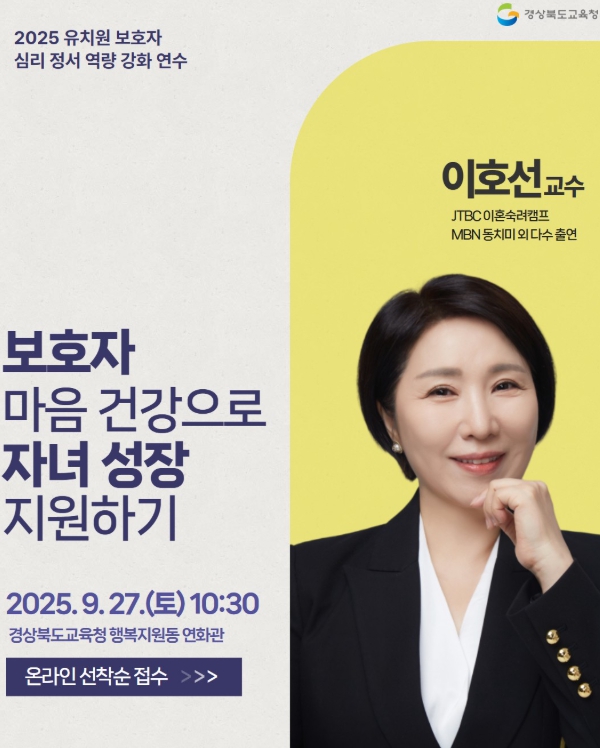 본 연수는 ‘보호자 마음 건강으로 자녀 성장 지원하기’라는 주제로 진행되며, 경북 도내 유치원 학부모 및 예비 학부모를 대상으로 한다.