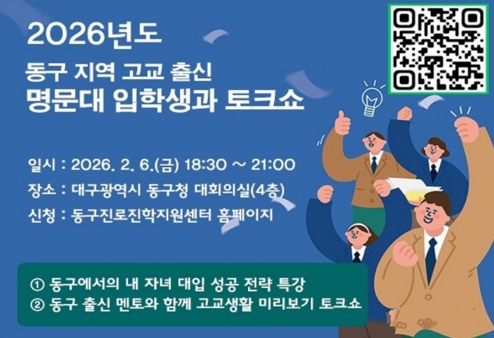 [파이낸셜경제=김지훈 기자] 대구 동구청은 오는 6일 오후 6시 30분, 동구청 4층 대회의실에서 관내 학생 및 학부모를 대상으로 ‘2026 내 자녀 대입 성공 전략 특강 및 멘토와 함께 고교생활 미리보기 토크쇼’를 개최한다.