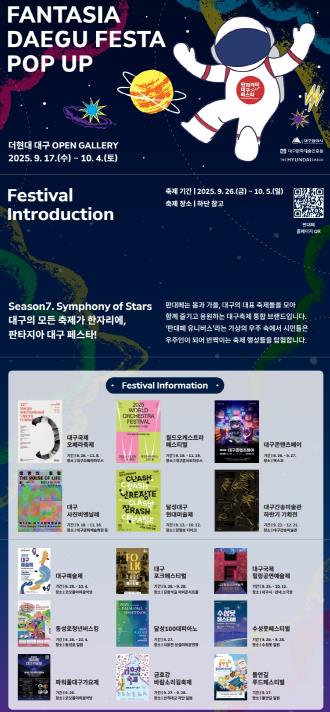 [파이낸셜경제=김지훈 기자] 2025 판타지아대구페스타 가을 축제가 일곱 번째 시즌(Season7. Symphony of Stars 별들의 노래)을 맞아, 대구를 대표하는 15개 축제를 소개하는 팝업 전시와 함께 다양한 이벤트로 시민들을 찾아간다.