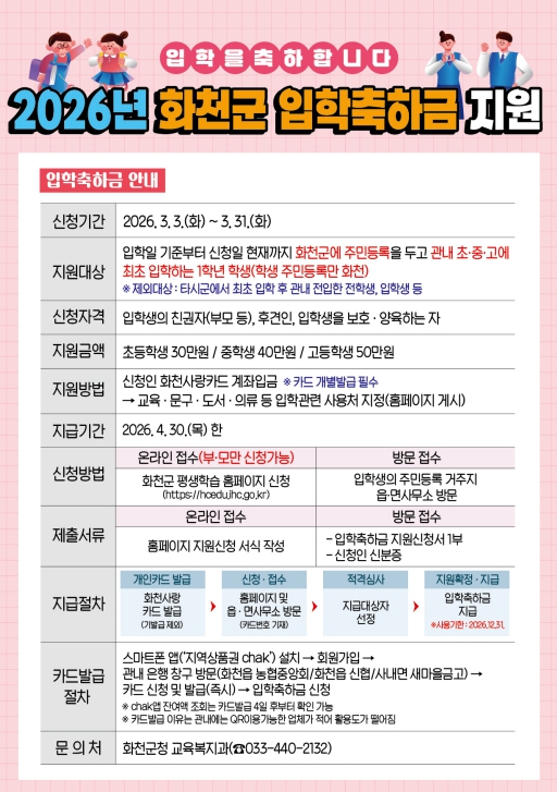 | ▲ 2026년 화천군 입학축하금 지원 안내문 |