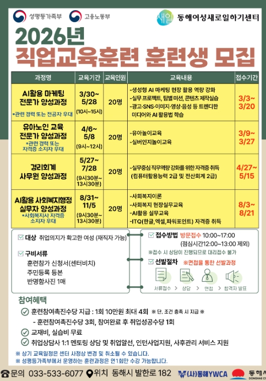 [파이낸셜경제=조성환 기자] 동해시와 동해여성새로일하기센터는 2026년 경력보유여성, 경력단절여성, 결혼이민여성의 안정적인 재취업과 일자리 창출을 위해 '직업교육훈련'과 '새일여성인턴 사업'을 연계 추진한다고 밝혔다.
