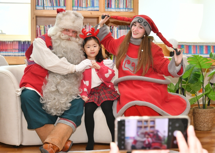 | ▲ 핀린드 로바니에미시 리얼 산타와 요정 엘프가 지난 21일 화천 어린이 도서관을 방문해 어린이들과 즐거운 시간을 보내고 있다 |