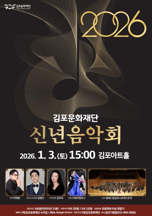 [파이낸셜경제=김기보 기자] (재)김포문화재단이 새해 첫 무대로 내년 1월 3일 김포아트홀에서 '2026년 김포문화재단 신년 음악회'를 개최한다고 밝혔다.