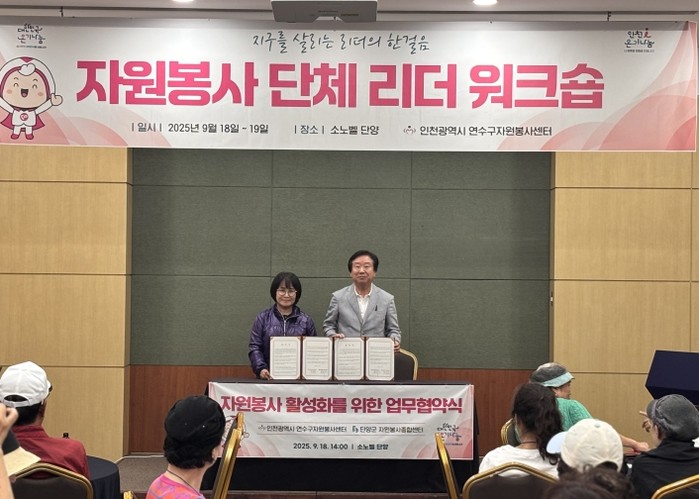 [파이낸셜경제=김기보 기자] 인천광역시 연수구자원봉사센터와 충청북도 단양군자원봉사종합센터는 18일 (단양소노벨)에서 지역간 자원봉사 활성화와 네트워크를 통해 지역사회 발전을 위한 업무협약(MOU)을 체결했다고 밝혔다.