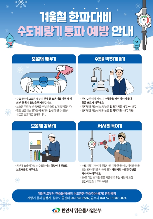박종구 급수과장은 “다가오는 겨울철 한파와 대설에 대비해 수도시설 유지관리에 최선을 다할 것”이라며 “각 가정에서도 따뜻하고 안전한 겨울철을 보내기 위한 동파예방 활동에 적극적으로 참여해주시길 바란다”