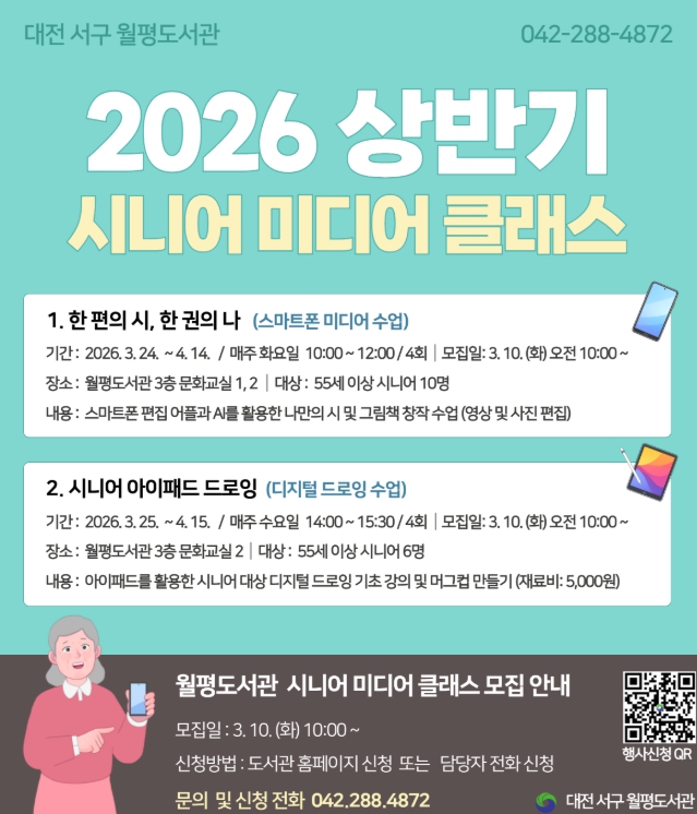 [파이낸셜경제=김영란 기자] 대전 서구 월평도서관은 중장년층의 디지털 활용 능력 향상과 창작 활동 지원을 위해 상반기 ‘시니어 미디어 클래스’를 운영한다고 4일 밝혔다.