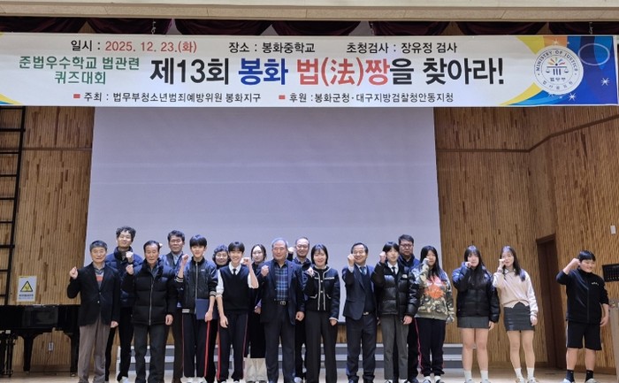 [파이낸셜경제=김지훈 기자] 봉화군에는 지난 23일 법무부 청소년범죄예방위원 봉화지구협의회가 주최하는 2025년 준법우수학교 퀴즈대회‘제13회 봉화 법(法)짱을 찾아라’가 봉화중학교 대강당에서 성황리에 개최됐다.