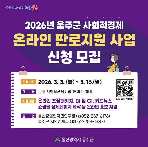 [파이낸셜경제=김예빈 기자] 울산 울주군이 3일부터 오는 16일까지 ‘2026년 울주군 사회적경제 온라인 판로 지원사업’에 참여할 기업을 모집한다고 밝혔다.