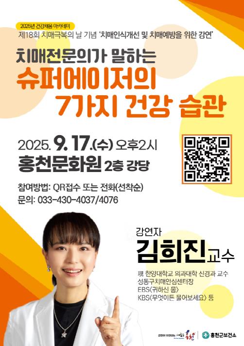 홍천군보건소 치매안심센터는 제18회 치매 극복의 날을 맞아 오는 9월 17일 오후 2시 홍천문화원에서 2025년 건강채움 아카데미를 개최한다고 밝혔다.