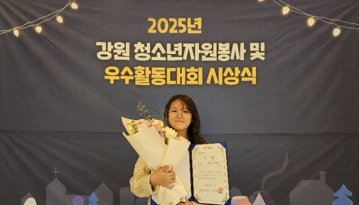 [파이낸셜경제=조성환 기자] 영월군청소년문화의집봉사동아리 소속 이가윤(무릉초6)이 지난 14일 ‘2025년 강원 청소년자원봉사 및 우수활동대회’ 시상식에서 한국청소년활동진흥원 이사장상을 받았다.