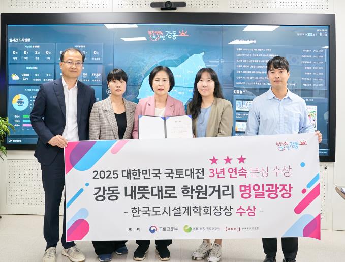 [파이낸셜경제=김영란 기자] 강동구는 지난 18일 ‘2025 대한민국 국토대전’에서 ‘강동 내뜻대로 학원가 명일광장 조성사업’으로 한국도시설계학회장상을 수상했다고 24일 밝혔다.