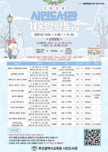 [파이낸셜경제=박영진 기자] 부산광역시립시민도서관(관장 이은경)은 내년 1월 6일부터 31일까지 시민도서관에서 부산 지역 유아 및 초등학생 195명을 대상으로 ‘겨울방학특강’을 운영한다.