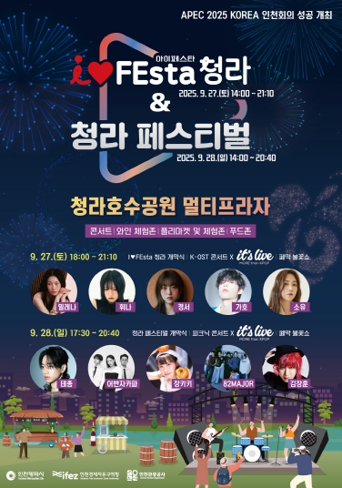 [파이낸셜경제=김기보 기자] 인천경제자유구역청이 주최하고 인천관광공사(사장 백현)가 주관하는‘2025 I♥FEsta 청라 & 청라 페스티벌’이 9월 27일과 27일 이틀간 청라 호수공원 멀티프라자에서 열린다.