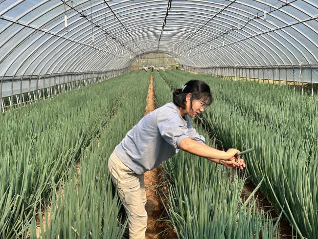 | ▲ 대파 생육 상황을 살펴보고 있는 모습. |