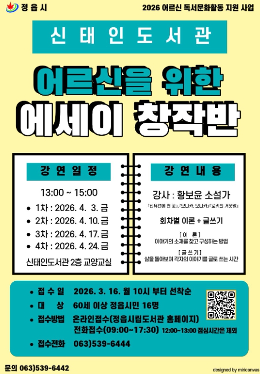 도서관 관계자는 “어르신들이 자신의 생생한 이야기를 직접 글로 남기며 지나온 삶의 가치를 새롭게 발견하는 뜻깊은 시간이 되기를 바란다”며 “앞으로도 정읍 시민들을 위한 다채로운 세대별 맞춤형 독서문화 프로그램을 지속적으로 발굴하고 운영하겠다”고 밝혔다.