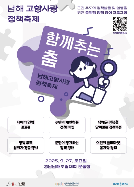 축제는 오는 9월 27일 13시부터 경남도립남해대학 운동장에서 개최되며, 주요 프로그램으로 △정책 마켓 및 발표 △정책 채택형 경매 △정책 퀴즈 수능이 운영된다.