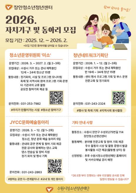 장안청소년청년센터 관계자는“2026년은 스스로 기획하고 실행하는 과정에서 성장할 수 있도록 이끌고, 청소년과 청년이 함께 움직이며 더 큰 지역 변화를 만드는데 중점을 두겠다.”라고 설명했다.