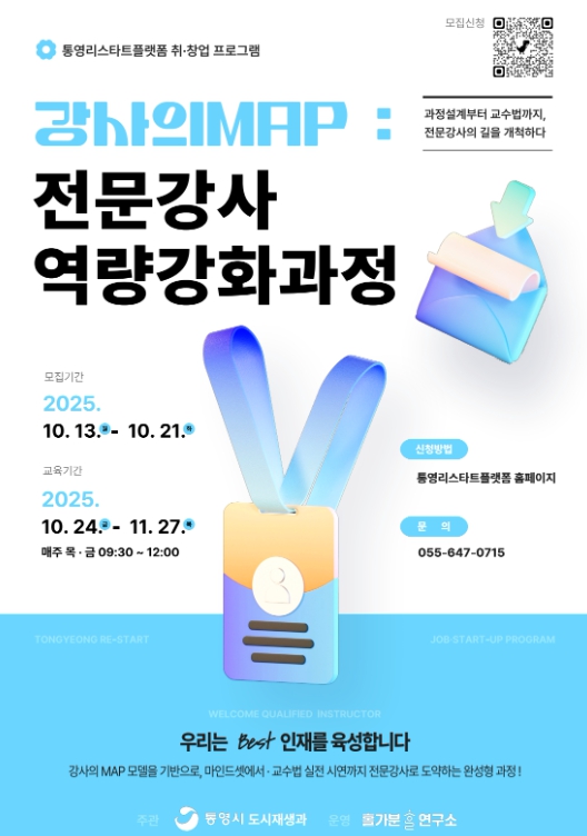 교육기간은 10월 24일부터 11월 27일까지이며, 매주 목요일과 금요일 오전 9시 30분부터 12시까지 통영리스타트플랫폼 세미나실에서 진행된다.