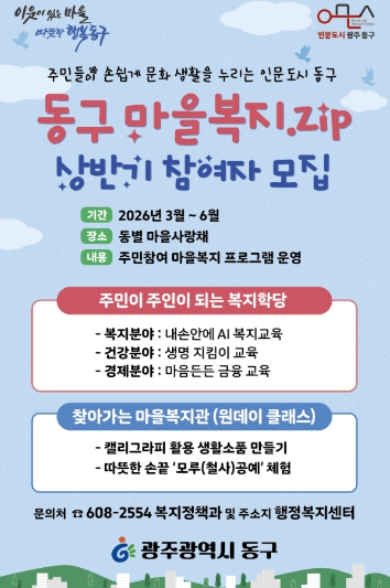 [파이낸셜경제=김예빈 기자] 광주 동구는 주민 누구나 일상 속에서 복지를 배우고 참여할 수 있는 ‘동구 마을복지.ZIP’ 사업을 오는 3월부터 본격 추진한다고 밝혔다.