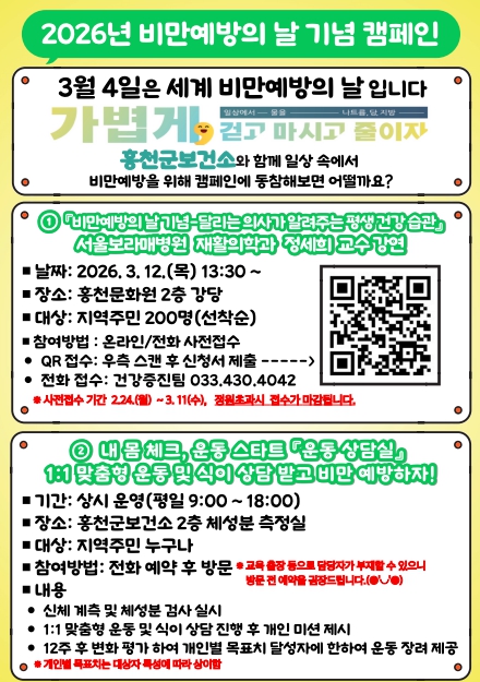 [파이낸셜경제=조성환 기자] 홍천군은 3월 4일 비만 예방의 날을 맞아 군민의 건강생활 실천 문화 확산을 위한 비만 예방 캠페인을 추진한다.