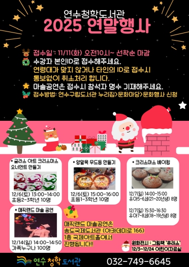 연수구 관계자는 “연말에 가족과 함께 도서관에서 독서의 즐거움을 느끼시길 바란다.”라며 “다가오는 2026년에도 주민들이 일상 속 문화를 누릴 수 있도록 다양한 독서 문화 행사를 지속적으로 추진하겠다.”라고 전했다.