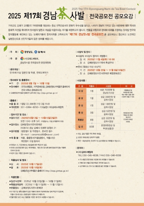 지난 2003년부터 개최된 ‘경남 찻사발 전국 공모전’은 매년 전국의 도예인들이 정성스럽게 만든 찻사발을 통해 전통의 미학과 현대적 감각을 선보여 온 권위 있는 도자 공모전이다.