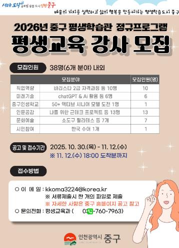 [파이낸셜경제=김기보 기자] 인천시 중구는 오는 2026년 한 해 동안 중구 평생학습관에서 정규 프로그램을 담당할 전문성과 열정을 갖춘 전문 강사 38명을 공개 모집한다고 31일 밝혔다.