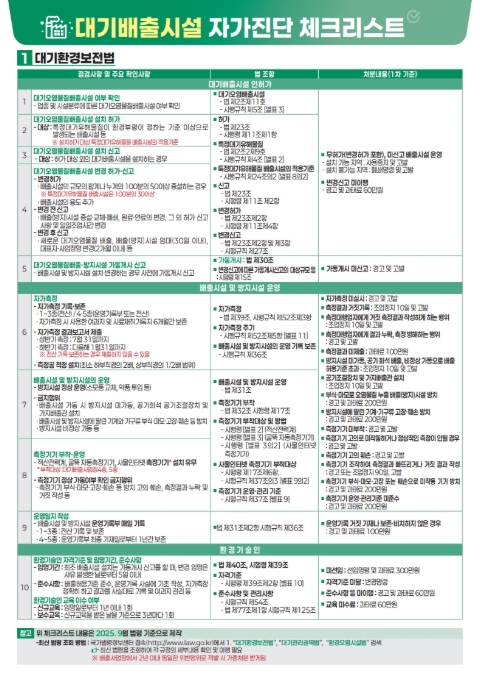 이번에 배포된 점검표는 사업장이 스스로 오염물질 배출시설 및 방지시설 운영 전반을 점검할 수 있도록 구성됐으며 배출시설 허가·신고 사항, 자가측정 이행 여부, 방지시설 정상 가동, 측정기기 부착·운영 상태, 환경기술인 선임 및 교육 이수 여부 등 12개 주요 항목과 세부 점검 사항이 담겨 있다.