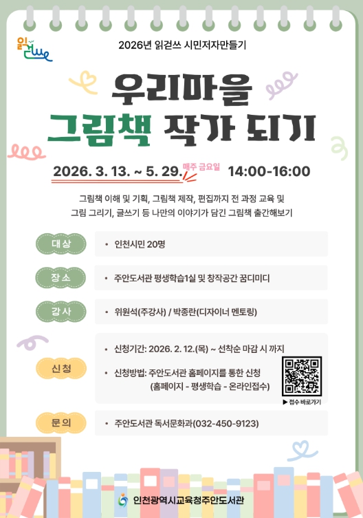 [파이낸셜경제=김기보 기자] 인천광역시교육청주안도서관은 읽걷쓰 시민저자 양성을 위한 ‘우리마을 그림책 작가 되기’ 프로그램 참여자를 모집한다.