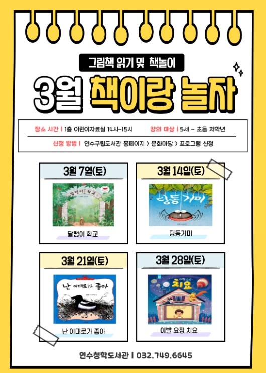 이번 프로그램은 전문 독서강사가 5세부터 초등 저학년 어린이를 대상으로 매주 토요일(1~4주) ▲연수청학도서관 2시, ▲해돋이도서관 11시에 운영하며, 책을 읽어주고 다양한 책 놀이를 진행한다.