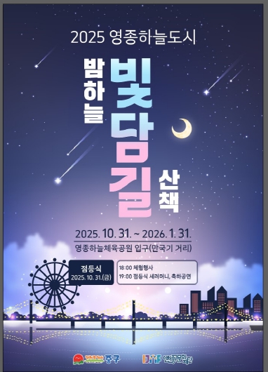 [파이낸셜경제=김기보 기자] (재)인천중구문화재단(이사장 김정헌)은 올해 10월 31일부터 오는 2026년 1월 31일까지 3개월간 야간 경관조명 ‘2025 영종 빛 축제 - 영종하늘도시 밤하늘 빛담길’을 운영한다고 밝혔다.