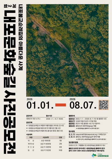 이번 공모전은 산림청 지정 국가숲길인 내포문화숲길이 지닌 내포지역의 역사·문화·생태적 가치와 명소, 풍경 등 다양한 자원을 발굴하고, 내포불교순례길의 사계절 경관을 홍보하기 위해 2024년부터 추진 중이다.