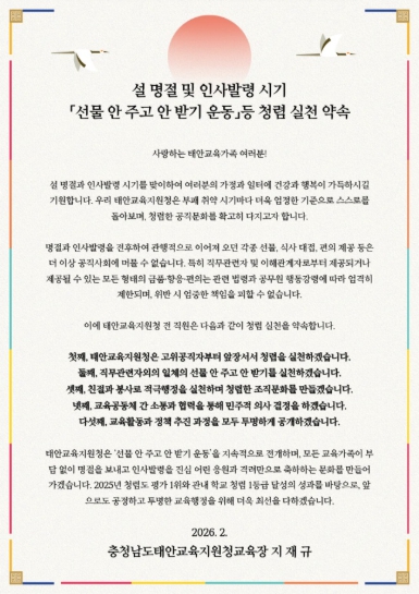 | ▲ 태안교육지원청, 설 명절 맞아 ‘선물 안 주고 안 받기’ 청렴서한문 발표 |