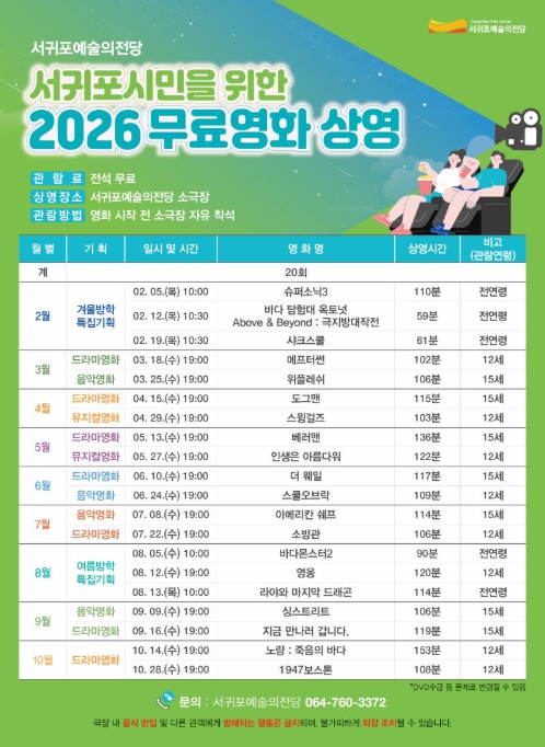 서귀포예술의전당 관계자는 “온 가족이 함께 즐길 수 있는 웃음과 감동의 영화를 준비했다며, 시민들이 일상에서 문화예술을 쉽게 접할 수 있도록 다양한 프로그램을 지속적으로 운영해 나가겠다”라고 밝혔다.