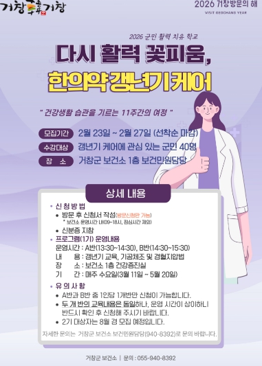 거창군 관계자는 “갱년기는 제2의 인생을 준비하는 중요한 시기인 만큼, 비약물적이고 안전한 한의약 건강법을 통해 주민들이 갱년기를 활기차고 건강하게 극복할 수 있도록 최선을 다하겠다”고 말했다.