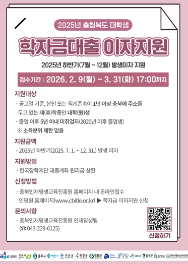 신청은 충북인재평생교육진흥원 누리집에서 온라인으로 진행되며, 제출 서류에 대한 심사를 거쳐 5월 중 이자 지원이 이뤄질 예정이다.