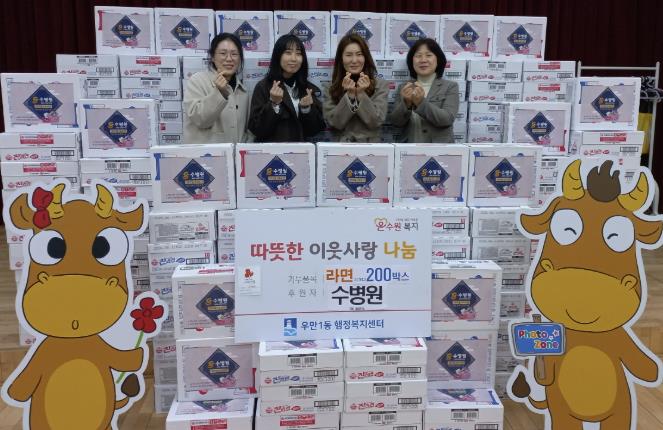이에 대해 최명희 우만1동장은 “매년 잊지 않고 따뜻한 나눔을 실천해 주시는 수병원에 진심으로 감사드린다”며, “기탁해 주신 라면은 꼭 필요한 이웃들에게 정성껏 전달해 모두가 온기 가득한 설 명절을 보낼 수 있도록 하겠다”고 전했다.