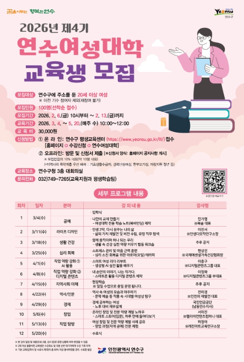 모집 대상은 연수구 거주 20세 이상 성인 여성 100명이며, 연수구 평생교육센터 누리집에서 선착순으로 신청할 수 있다.