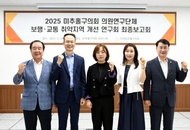 [파이낸셜경제=김기보 기자] 인천광역시 미추홀구의회 의원연구단체 '보행·교통 취약지역 개선 연구회'(대표의원 박수연, 연구의원 장규철·배상록·김태계)가 2025년 9월 24일 미추홀구의회 세미나실에서 연구용역 최종보고회를 개최하고 성공적으로 마무리했다.