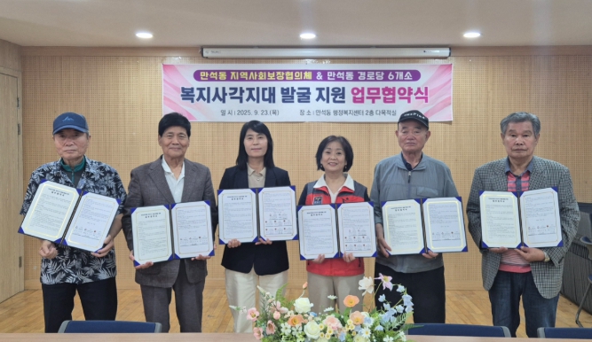 [파이낸셜경제=김기보 기자] 인천 동구 만석동 지역사회보장협의체(민간위원장 김은희)는 지난 23일 관내 경로당(만석동 제1경로당 등 6개소)과 복지사각지대 위기가구 발굴·지원 위한 업무협약을 체결했다고 밝혔다.