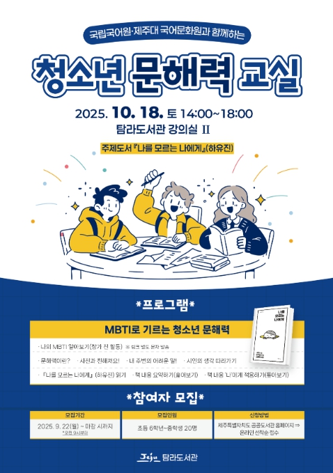 [파이낸셜경제=김영란 기자] 제주시 탐라도서관은 제주대학교 국어문화원 지원사업의 일환으로 ‘청소년 문해력 교실’을 운영한다.