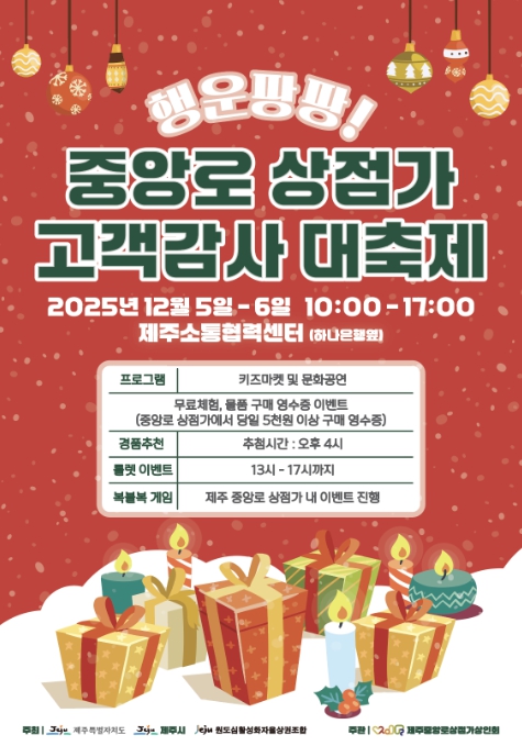 [파이낸셜경제=김영란 기자] 제주시는 12월 5일과 6일 오전 10시부터 오후 5시까지 중앙로 상점가 일대에서 ‘행운팡팡! 고객감사 대축제’가 개최된다고 밝혔다.