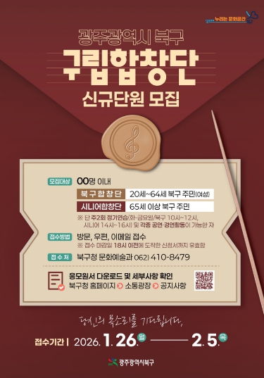 [파이낸셜경제=김예빈 기자] 광주광역시 북구가 아름다운 목소리로 주민들과 소통하는 구립합창단 신규 단원을 모집한다고 21일 밝혔다.